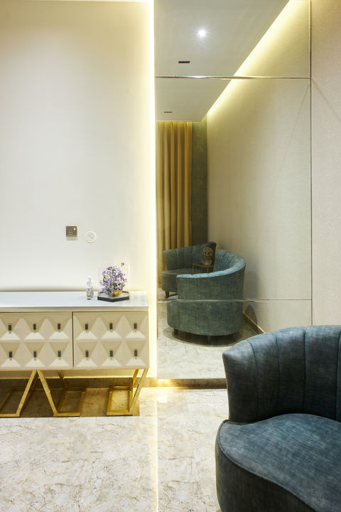The side consoles with geometric detailing and gold accents adds depth and character to the room. A mirrored wall expands the sense of space while reflecting soft lighting, bringing warmth and elegance.