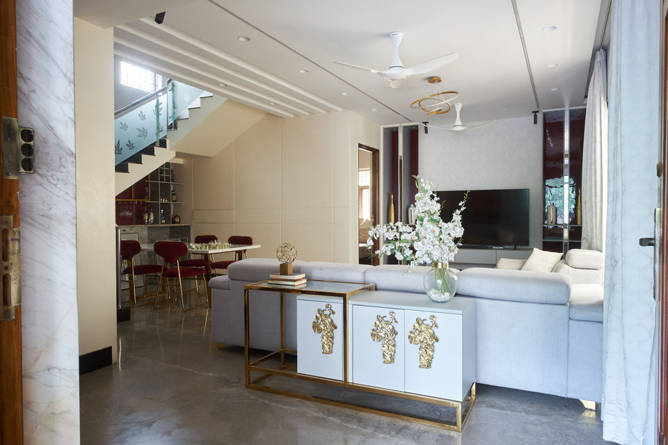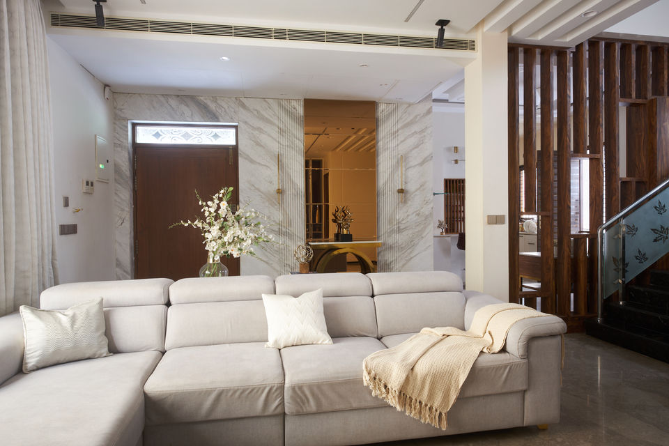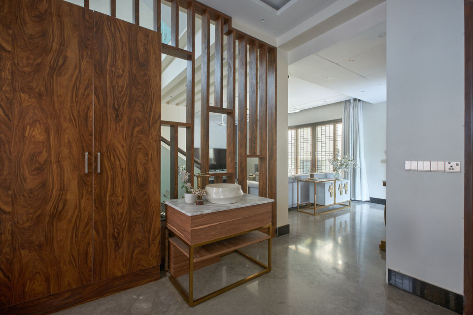 On one side, wooden slats serve as a partition—beautifully crafted to divide the areas without making the room feel closed off. The staircase with its etched glass detail brings a hint of charm and character, tying in beautifully with the natural tones throughout.