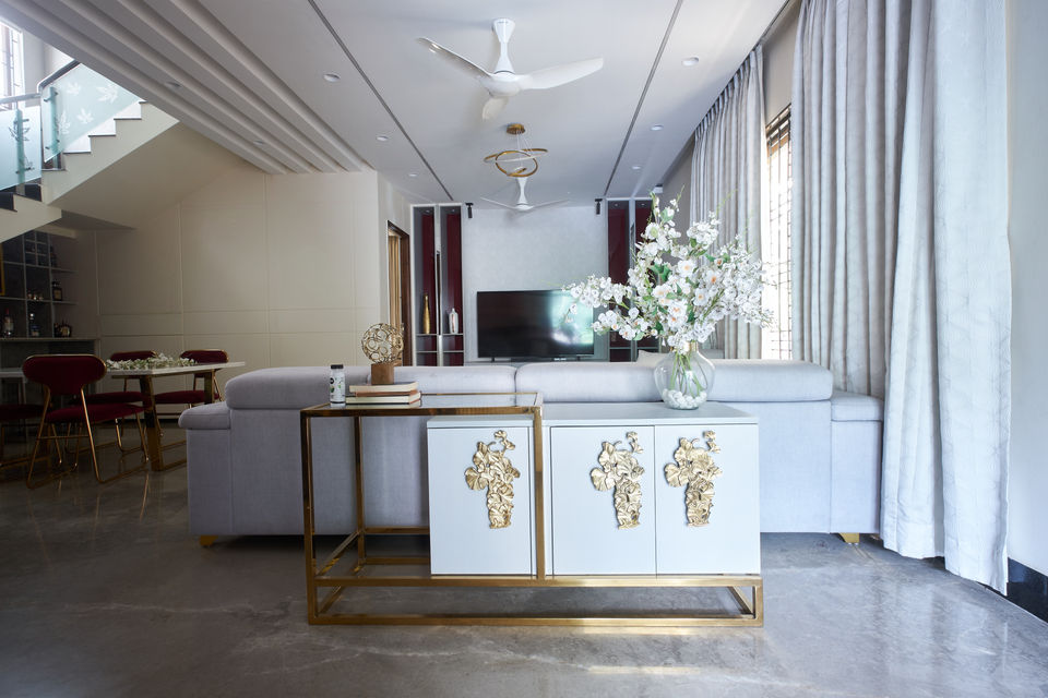 This common space feels like the perfect blend of elegance and comfort—designed to feel luxurious, yet completely livable. The soft, neutral-toned sectional invites you to sink in and relax, while the textured cushions and cozy throw add a sense of warmth and personality. A vase of white blossoms on the center table brings a fresh, calming vibe to the space.